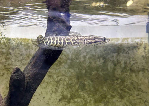 図1. 水槽をすいすい泳ぐカムルチーの若い個体(茨城大学水圏フィールドステーション)。
