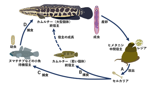 図4. ライギョノネドコムシの日本における生活史。A:中間宿主(幼虫の宿主のこと)となるヒメタニシから、セルカリアという幼虫が水中に出る。BとC:セルカリアが、カムルチーの若い個体や、他の小魚に食べられる。D:セルカリアを食べた小魚が待機宿主(カムルチーの幼虫を保持した状態)となり、さらにそれが大型のカムルチーに捕食される。