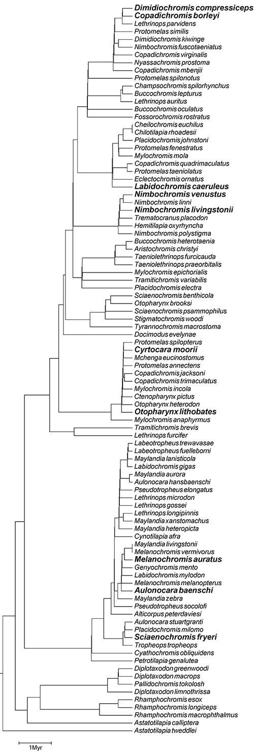 タンガニーカ湖にくらべると新しい湖であり、湖ができたときに周辺の河川から湖に侵入したシクリッドが基になり、さまざまな生活環境に適応して一つの種から多様な種が生まれた。下の系統樹はマラウィ湖のシクリッドの系統樹である。およそ160万年という地質学的には比較的短期間に多くの種に分れたことが分かる。