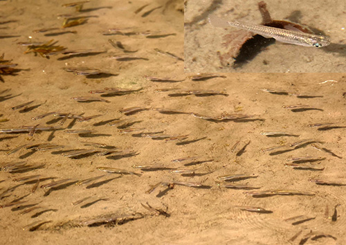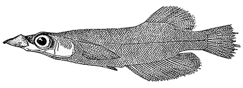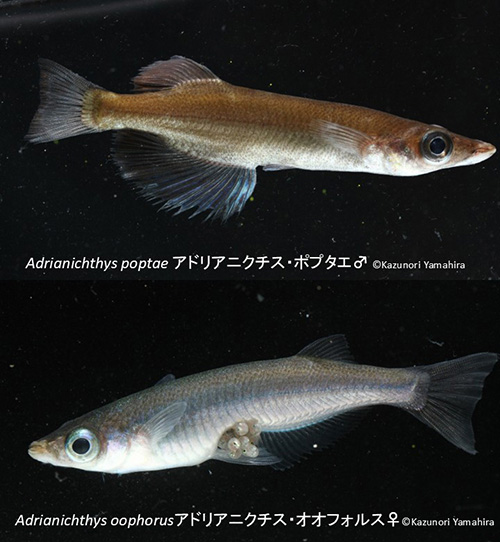 メダカ科のほとんどはメダカ属Oryziasに分類されるが、アドリアニクチス属Adrianichthysという別属に分類されるものが4種ある。これらはすべてインドネシアのスラウェシ島ポソ湖だけの固有種であり、英語でduckbilled fish(カモの嘴の魚)と呼ばれる(2)。このうち下の図で示したアドリアニクチス・クルイティは、近年目撃例がなく、すでに絶滅してしまった可能性がある。
