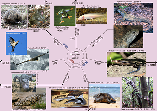 四足類は脊索動物門のなかで陸上に進出したグループであり、現生の四足類は両生類と羊膜類に大別される。