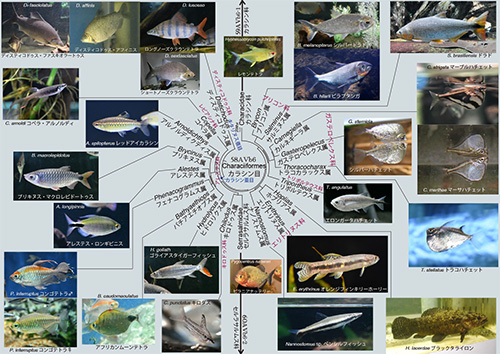 図58AVb6でアフリカに分布するのは、ディスティコドゥス科Distichodontidaeとアレステス科Alestidaeであり(ほかに同図に登場していないキタリヌス科Citharinidaeとヘプセトゥス科Hepsetidae)、そのほかはすべて南北アメリカに分布する。
