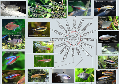 カラシン科は1,000種以上を擁するカラシン目最大の科で、主に南アメリカの熱帯地方の淡水域に分布する。