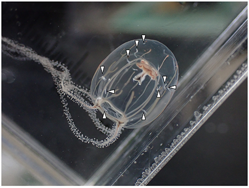 図4. ウラシマクラゲについた吸虫のメタセルカリア。時期と場所にもよるが、クラゲにはこのようにたくさんの吸虫がついていることがある(写真提供:関根百悠)。