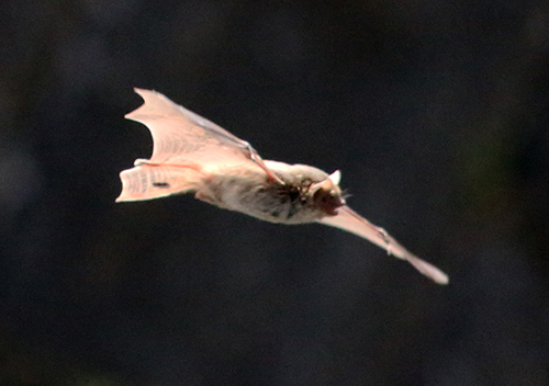 図2-1の写真は、香川県高松市の私の自宅付近の川で4月19日午前10時頃に撮影したものである。高松ではこの時期すでにツバメが渡ってきており、飛び方がツバメのように見えたが、よく見ると色が違い、アブラコウモリだと分かった。夕暮れ時にはたくさんのアブラコウモリが一斉に飛ぶが、この写真を撮った時に飛んでいたのは1頭だけであった。