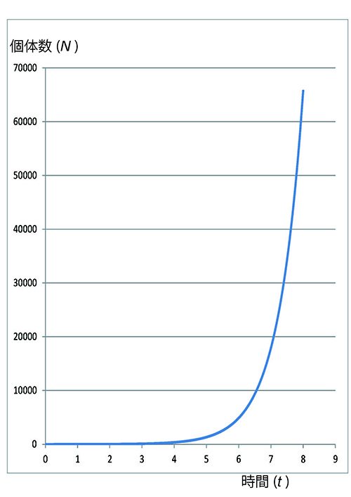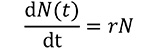集団の個体数Nが時間tとともにどのように変化するかは、増加率をrとして、次の式で表わされるー
