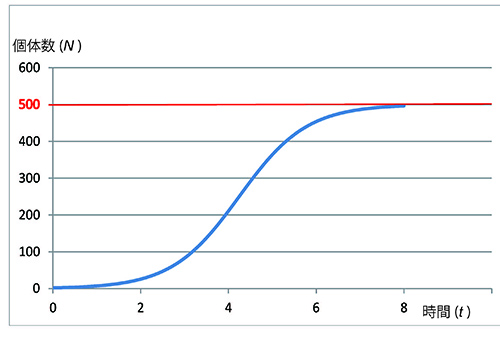 この微分方程式の解は少し複雑なので、ここでは示さないが、個体数の時間変化を図示すると図2-4のようになる。個体数が環境収容量よりもはるかに少ない状況では、個体数の変化はマルサスのモデルに従うが、個体数が増えると次第にその増加が頭打ちになり、全体としての曲線はS字型になる。