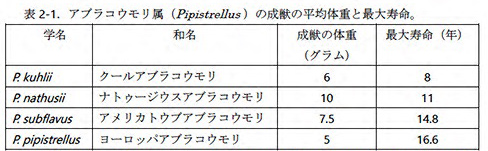 日本にはモリアブラコウモリ(P. endoi)という樹洞に棲む同属のコウモリがいて、P.abramusが帰化動物だとするとそれ以前からのものと考えられるが、この種の詳しい生態は分かっていない。それでも、同じアブラコウモリ属で研究が進んでいる種に関しては、いずれも長い最大寿命の記録が得られているので(表2-1)、日本のアブラコウモリが同属の中で特異な生活史をもっていることは確かである。