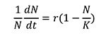 この式でKは環境収容量であり、その環境が維持できる個体数になる。個体数(N )が環境収容量(K )に近づくと、N/Kだけ増加率が減るということである。個体数が環境収容量に達したところで、増加率がゼロになる。もしもこれを超えると増加率は負になるので、個体数がこれを超えることはない。この微分方程式はロジスティック方程式と呼ばれる。