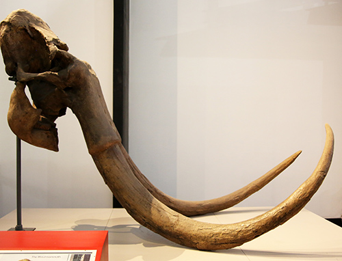 図7-10 ケナガマンモスの頭骨と牙(ロンドン自然史博物館)。これとは別のものであるが、アラスカで発見されたケナガマンモスの牙の化学分析により、その個体が一生を通じて移動した経路が判明した(8)。