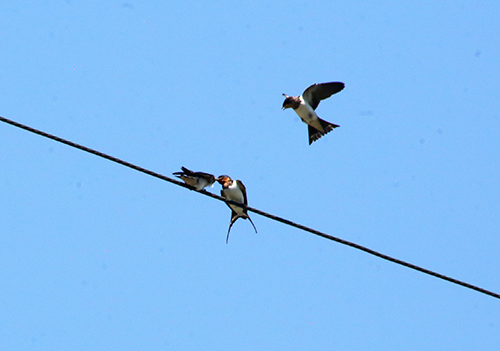 図7-1 親から給餌を受けるツバメ(Hirundo rustica;スズメ目ツバメ科)の幼鳥(左)。2021年5月23日、高知県足摺岬付近にて。