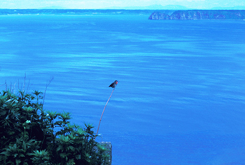 図7-4 ノゴマ(Calliope calliope;スズメ目ヒタキ科)のオス。1979年7月6日、北海道・大黒島にて。ノゴマは日本では主に北海道で夏鳥として繁殖する。オスの胸の赤い部分から、「日の丸」の俗称がある。