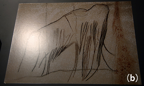 図7-9 (a)ケナガマンモス(Mammuthus primigenius)の骨格。中国・浙江自然博物館にて。(b)フランス石器時代の現生人類が描いたケナガマンモス。この時代のヒトの狩猟対象だったと考えられる。ロンドン自然史博物館。