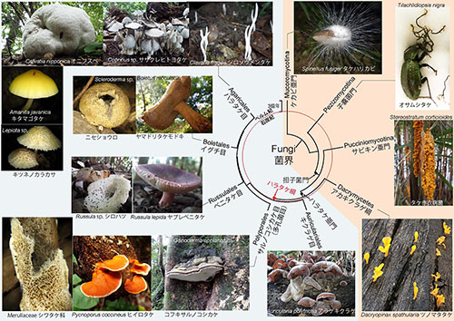 図14-1に菌類(動物界、植物界などとならんで「菌界」という)の系統樹マンダラを示した。菌類は、細胞核をもたない原核生物の細菌と区別するために「真菌類」と呼ばれることもある。菌類は植物のような光合成を行なわない従属栄養生物であり、栄養をほかの生物に依存する。その際、動物のようにほかの生き物を食べるのではなく、消化酵素を体外に分泌して有機物を分解し、得られた養分を吸収する。