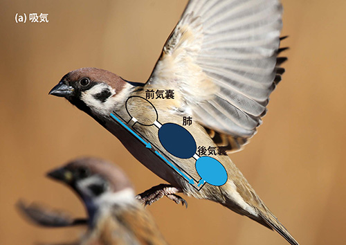 恐竜は独自の呼吸法を進化させたのである。恐竜は6600万年前に絶滅したとされているが、その子孫は鳥類として現在でも繁栄を続けている。従って鳥類も恐竜の仲間であり、鳥類以外の恐竜を「非鳥恐竜」という。恐竜が進化させ、現在の鳥類が引き継いでいる呼吸法が「気嚢(きのう)」による呼吸である(図14-6)。