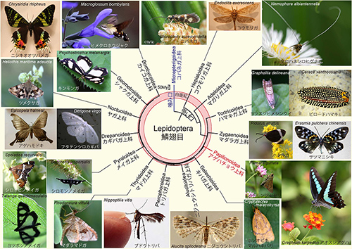 鱗翅目はトビケラと共通の祖先から進化したのである。アメリカ・フロリダ大学の河原章人らのグループは、ゲノムレベルの大規模な系統解析により、鱗翅目全体の系統進化の様子と系統が分化した時期を明らかにした(1)。図25-2に彼らの成果を系統樹マンダラのかたちで示す。
