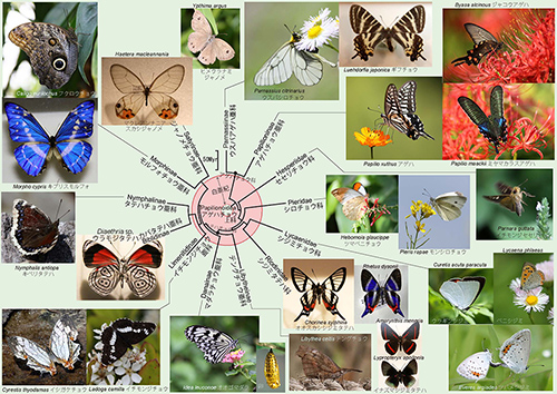河原らのグループは、さらにチョウの系統学についても解析を進めている。図25-3に彼らの成果であるアゲハチョウ上科の系統樹マンダラを示す(2)。