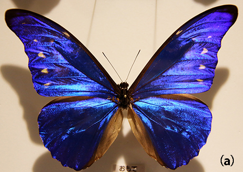 南アメリカに分布するモルフォチョウは、そのまばゆい金属色で有名である。モルフォチョウの金属色は、第15話で紹介したタマムシと同じように、色素によるものではなく、微細な構造によって光が干渉するため見える構造色である。