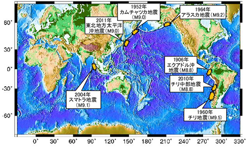 「マグニチュード9.0」は本当に大きな地震です。まずは下の図1を見て下さい。地震計を用いて地震の大きさをちゃんと測れるようになってから約100年が経ちますが、そのあいだに起きた超巨大地震を地図上に描きました。太平洋の沿岸域で多く発生している様子がわかります。