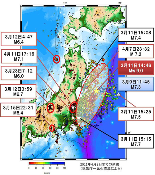 実際、東北地方太平洋沖地震の際には、何百kmにも及ぶ長さの断層がずれ動きました。2011年3月11日14:46、東北地方の太平洋側の沖合の海底の下でM9.0の地震が発生しました(これを本震と呼びます。一連の地震活動の中でもっとも大きかったものを指しています)。海底で巨大な断層がずれ動き、超巨大地震が発生したのです。