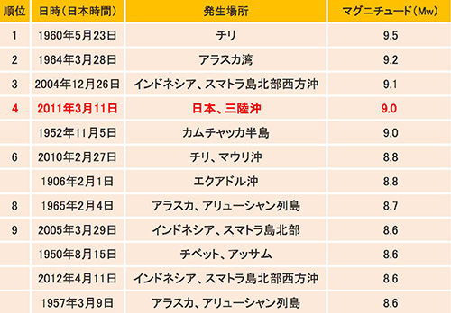 次に、最近約100年間に起きた地震の大きさランキングも見てみましょう(表1) 。1位はいまから約50年前の1960年に起きたチリ地震でM9.5です。2位はやはり約50年前のアラスカ地震(M9.2)。3位は記憶にも新しい、2004年のスマトラ地震(M9.1)。そして4位が東北地方太平洋沖地震(M9.0)。同じく4位のカムチャツカ地震とあわせても、過去100年間でM9.0以上の超巨大地震は5回しか起きていません。