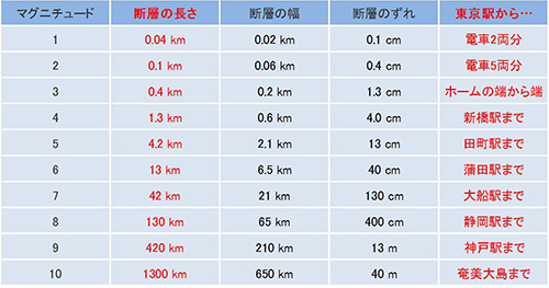 とはいえ、例えばM4.0の地震を引き起こす断層のサイズと、M9.0を引き起こす断層のサイズには、これほどの違いがあることに驚く方もおられることでしょう。M4.0の地震は東京駅から新橋駅まで続くような短い断層がずれて発生しますが、M9.0の地震が起きるためには東京駅から神戸駅まで続くような大断層が一気にずれ動かねばなりません。