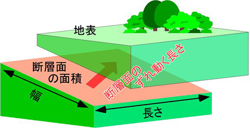 世界共通の物差しで、地震の大きさを正しく表すにはどうすればよいか? そのために地震学者たちは、地震の源である断層のずれに注目しました。前回も少し紹介しましたが、地震のときに放出されるエネルギーは、断層の長さ・断層の幅・断層のずれ動く長さに比例することが知られています。そこで「断層面の面積」×「断層面のずれ動く長さ」(図4)から、より正確なマグニチュードを求めることになりました。