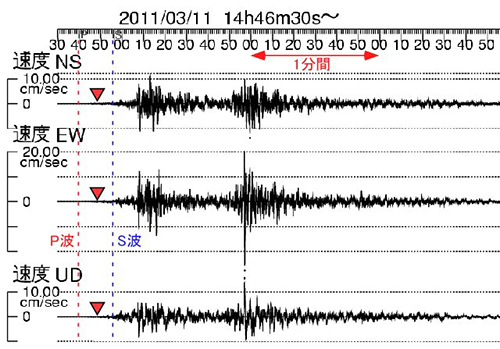 2011年3月11日、14:46頃にM9.0の超巨大地震が発生。その約30秒後、宮城県石巻市に設置されていた地震計が最初に揺れをキャッチしました。