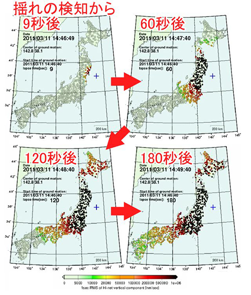 地震の揺れ始めから揺れ終わりのあいだ、日本各地の地震を観測している気象庁は、時々刻々とマグニチュードや震源を計算しています。その早業たるや、石巻市の地震計が微弱な揺れを検出したわずか5.4秒後、気象庁のコンピュータは「これはM4.3の地震だ」と判定しています。さらに1.1秒後には「M5.9へ修正!」。さらに2.1秒後(最初の揺れをキャッチしてから8.6秒後)には「M7.9の地震発生!」という地震速報を発表しています。