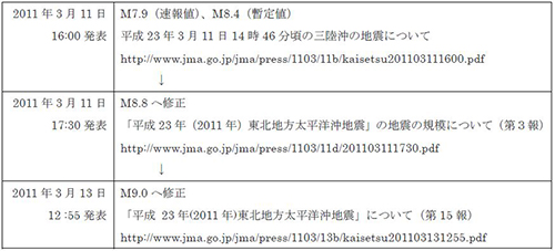 ところで、気象庁はその後もマグニチュードの修正を繰り返しています。地震発生の同日中に暫定値を修正し、その2日後にも再修正したのです(表1)。
