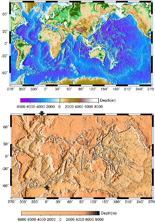 これは地球と火星の地図を比べたものです……と思いきや、実はどちらも地球の地図です。上側は見慣れた世界地図ですね。下側は海と陸を塗り分けていない世界地図です。地球から海を取り除いた地図と考えるとよいでしょう。こうすると、陸上だけでなく海底にも山や谷が沢山あることがよく分かります。いやむしろ、海底のほうが陸上よりも凸凹しているようにも見えます。
