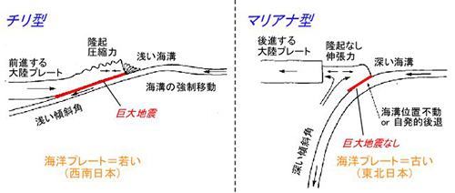 2011年以前は、日本列島の地震発生の様子も上田・金森の地震発生モデルで説明が可能でした。例えば西南日本(東海・近畿・四国・九州地方)の沖合にある「南海トラフ」では、フィリピン海プレートという若い海洋プレートが沈み込んでいます(図4)。これはチリ型の沈み込み(図2左)に似ています。また東北日本の沖合にある「日本海溝」では、年老いた太平洋プレートが沈み込んでいたので、マリアナ型の沈み込み(図2右)に相当します(より正確に言えば、東北日本の沈み込みはチリ型とマリアナ型の中間に分類されます)。