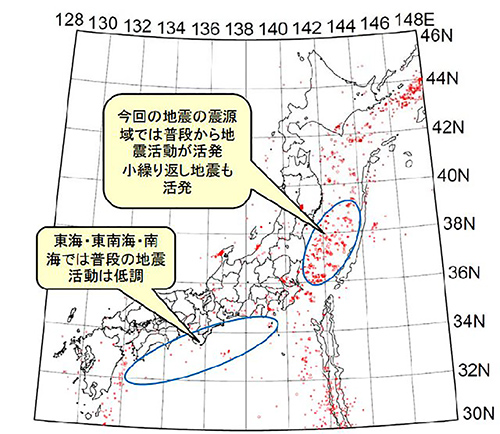 一方、東北日本沖の日本海溝沿いでは、マグニチュード8以下の地震が頻発していることが分かっていました。まるで中規模・小規模の地震のおかげで、巨大地震のエネルギーが溜まらない状況に見えます。