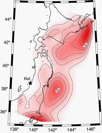 前回は、陸上での地殻変動観測によってもたらされた新しい発見を紹介しました(図1)。陸側のプレートと海側のプレートが広範囲でくっついている様子(固着)が2006年に明らかになったのです。おそらくは、このプレート境界の固着部分に蓄えられた歪みが2011年3月11日に一気に解放されて、マグニチュード(M)9の超巨大地震が起きたのだと考えられています。