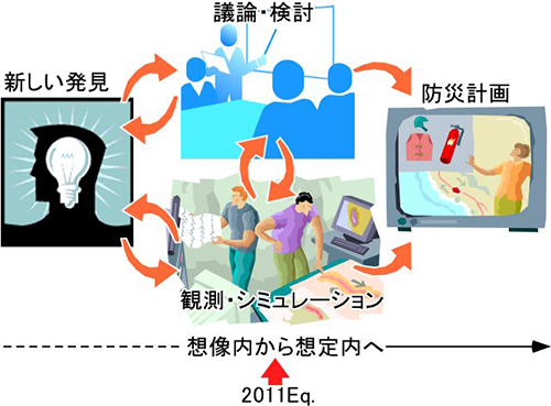地震学者たちにとって、2011年東北地方太平洋沖地震は想定外の地震でした。より正しく言えば「地震学者たちは東北沖の超巨大地震の発生を多少想像していたが、その対策を練れるほどまで観測データは集まっておらず、議論も深まってはなかった」と言えるでしょう(図4)。
