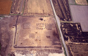地中レーダーを使って地下を立体的に透視したところ、図5の上側のようなイメージを得ることができました。サイコロの六の目のように規則正しく並んでいる丸い模様が目立ちますが、同じような沢山の丸い穴が地中レーダーの調査地域のすぐ南側の発掘現場でも見つかりました(図5の下側)。これは当時の建物の柱の跡です。地中レーダーで見つかった丸い模様も、同様の建物の柱の跡でしょう。このようにして、遺跡の全てを掘り返さず、遺跡の全容を解明できる点が地下探査のメリットの一つと言えます。