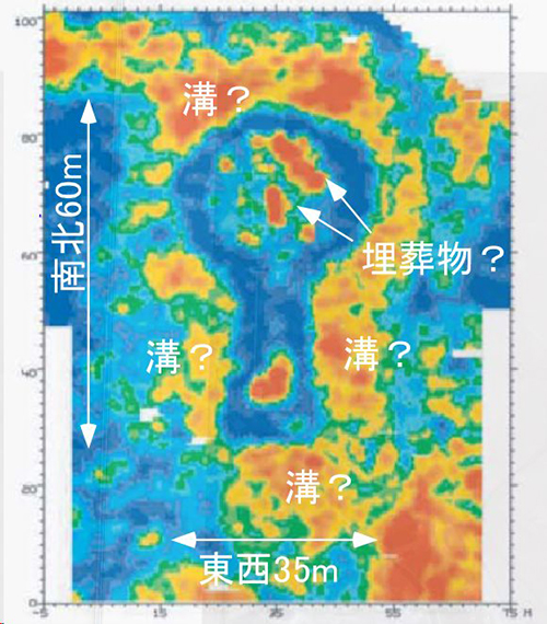 もう一例見てみましょう。今度は宮崎県の西都原古墳での地中レーダー探査の結果です。この古墳は前方後円墳で、古墳の高まり部分は地上に丘となって顔を出していましたが、古墳の周囲は土に埋もれていました。前方後円墳の周りには溝があるはずですが、肉眼で土を観察しても判別不能。一方、地中レーダーは溝を見事に検出しました。さらに古墳の中央部には、地下に埋葬されたと思われる何か(お棺?)が複数見つかりました。