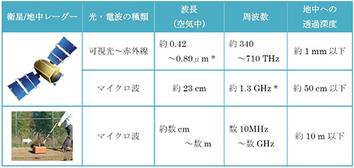 ここで、地中レーダーや人工衛星で使われている光や電波の特徴(周波数・波長)と、地中へ届く深さ(透過深度、探査深度と同程度)を表1にまとめました。使う道具(センサー)によって、得られる地下情報に違いがあるので、目的に応じて使い分けることが大事です。