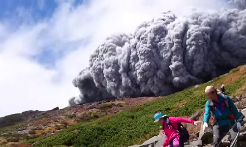 図1. 御嶽山登山者による投稿動画より(https://www.youtube.com/watch?v=7Ea3uED1Zgc)。 九合目避難小屋の少し上から撮影開始された。