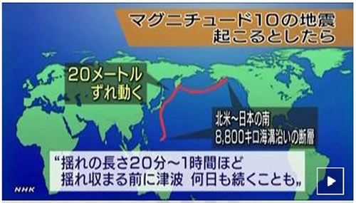 しかも今後発生する地震の規模はM8やM9とは限りません。2012年11月、ある地震学者によって驚くべき発表がなされました。2011年の東北地方太平洋沖地震(M9)の30倍以上のエネルギーを持つ、M10の超巨大地震の発生の可能性が指摘されたのです(図4)。地震の断層は全長約8,800km。日本の南から始まり、千島列島、カムチャッカ半島を越えて、アラスカまで至る大断層が一気に動くとM10の超巨大地震になるそうです。想像を上回る規模の地震ですが、注意するに越したことはありません。