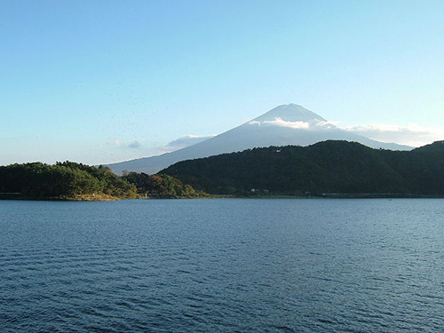 図1. 河口湖(山梨県)の向こう側に見える富士山。2008年11月撮影。富士山はもちろん活火山です。