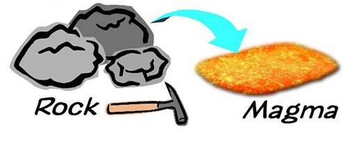 では、どうやったらマントルの岩石が溶けてマグマができるでしょうか? これは「どうやったら氷が水になるのか?」と同じで、以下のうち、どれか1つ以上を満たすと溶け始めます。