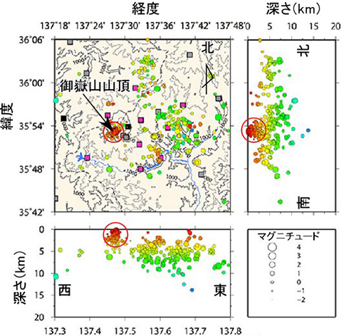 図1. 2014年9月1日~30日の御嶽山周辺での地震活動の様子。左上:水平面(四角は各機関の地震観測点)、右上、:南北断面、左下、東西断面に地震の震源を投影(円)。各円の大きさはマグニチュードを、また各円の色は震源の深さを示す。
