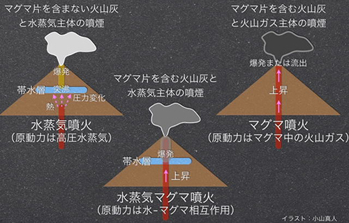 今回の噴火の「タイプ」も、噴火予知を難しくしました。噴火のメカニズムには大きく分けて3種類あります。まずは、(1) 水蒸気噴火(図4左、水蒸気爆発とも言われます)。地下水を含む地層(帯水層と言います)とマグマは直接触れませんが、地下水がマグマに熱せられて水蒸気になり、噴火を引き起こします。次は、(2) 水蒸気マグマ噴火(図4中、マグマ水蒸気爆発とも言われます)。これはマグマと地下水が直接触れ合って、水蒸気が大量に発生することにより噴火を引き起こすタイプです。このとき、マグマ本体も細かく壊れるので、水蒸気とマグマの欠片が火口から一緒に噴き出してきます。そして (3)マグマ噴火(図4右)。マグマ自体が山頂直下まで上がってくる際に、マグマの中で火山ガスが発生し、この圧力が噴火を引き起こします。今回の御嶽山の噴火では、火山灰中に新しいマグマの欠片は含まれていませんでした。つまり(1)の「水蒸気噴火」が起きたのだと考えられています(図5)。