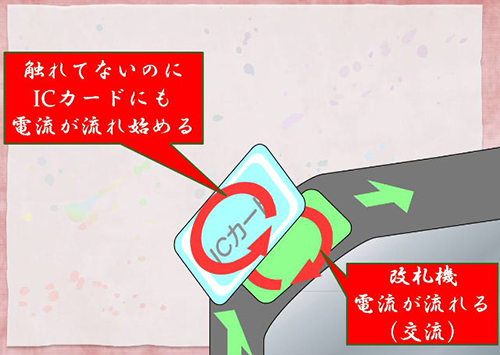 このように、改札機の電流が(改札機に触れてもいない)ICカードに流れ始める現象を「電磁誘導」と呼んでいます。離れていても働くのが特徴です。