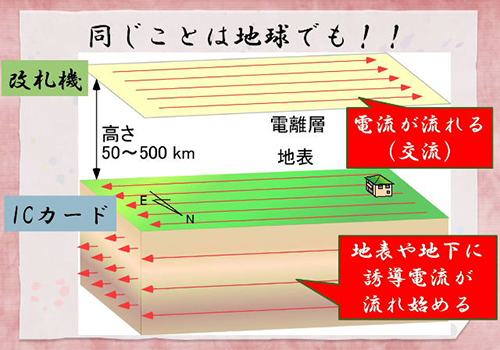 空気には普通、電気は流れませんが、空気の上層部では紫外線やX線の影響で空気の分子がプラスとマイナスの電気を帯びたイオンに分離しています(「電離」と呼びます)。この空気の層は「電離層」と呼ばれていて、電気を通す特殊な空気の層です。ここには絶えず電流が流れており、電流の強さは時々刻々変化しています(交流)。そう、駅の「改札機」と同じなのです。