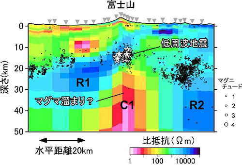 富士山の真下、深さ20 ~ 50km の地域には周囲よりも10倍~100倍ほど電気が流れやすい部分(図5のC1の部分:赤色)が見られます。この部分のすぐ上には火山特有の地震活動がみられます(図5の星印)。低周波地震といって、普通の地震よりも低い周波数の振動(ガタガタガタというよりもユラユラユラとした揺れ)を発生する特殊な地震です。電気の流れやすい部分や低周波地震は、富士山直下にあると思われるマグマ溜まりや、マグマから出てきたガスや熱水(熱い地下水)と関係があると考えられています。