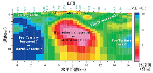 実際にどのようにして、この壮大な現象を測定しているかについては次回に詳しく述べることにして、今回はこの地下探査手法(地磁気地電流法あるいはマグネトテルリク法、略してMT法と言います)によって明らかにされた、火山内部の様子を見てみましょう。