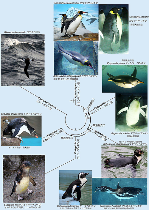 次に分かれたのが、ジェンツーペンギン属である。この属のアデリーペンギンは南極大陸、ジェンツーペンギンも南極周辺の島々で繁殖する。これらのことから、現生のペンギンの共通祖先は南極周辺の寒冷な地域で進化したと考えられる(図11-1の共通祖先1と2)。