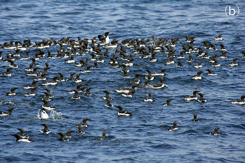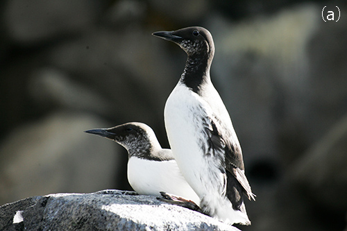 それでは北極に近いところに、ペンギンのような鳥はいないのであろうか。実はペンギンにそっくりな鳥がいる。ペンギンはペンギン目という独自の目を構成しているが、北半球のペンギンのそっくりさんは、ウミガラスというチドリ目・ウミスズメ科の鳥である。図11-3aのハシブトウミガラスは見た目もペンギンのようで、図11-3bのように海で魚などをとる様子もペンギンに似ている。ただし、この種は図11-3cのように空を飛ぶことができる。ハシブトウミガラスは北極海と北太平洋、北大西洋に広く分布する。